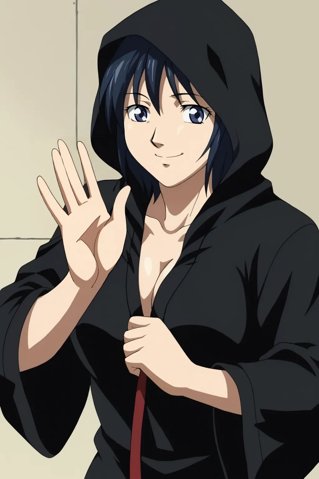 BBProtoRie, breasts, cleavage, black robe, hood, open clothes,