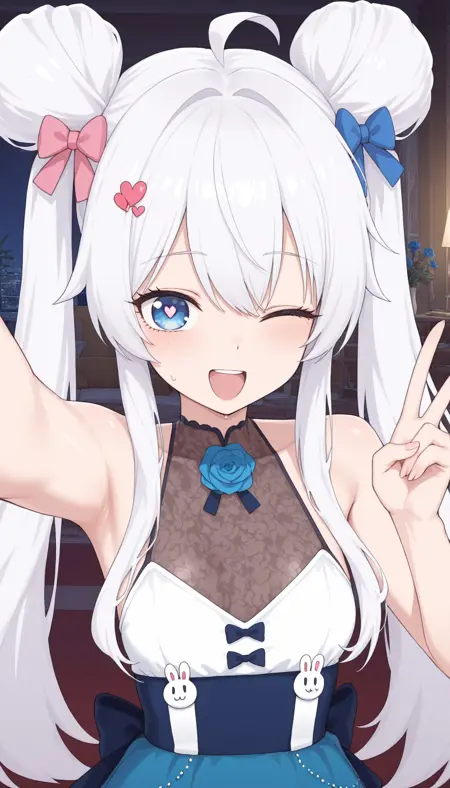 기본: moji, 더블 번, 파란 눈, 헤어번, 트윈테일, 긴 머리, 하트, 흰 머리, 리본, 파란 리본, 분홍 리본, ahoge, 사이드락, 하트 머리, 작은 가슴, 하트 머리 장식, 헤어 리본