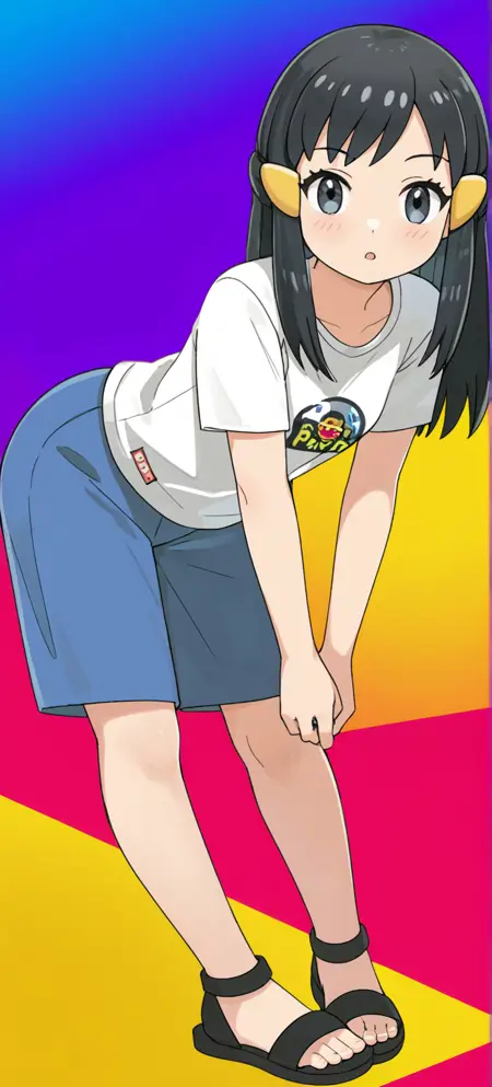 print shirt, white shirt, t-shirt, short sleeves, blue shorts, sandals, black footwear