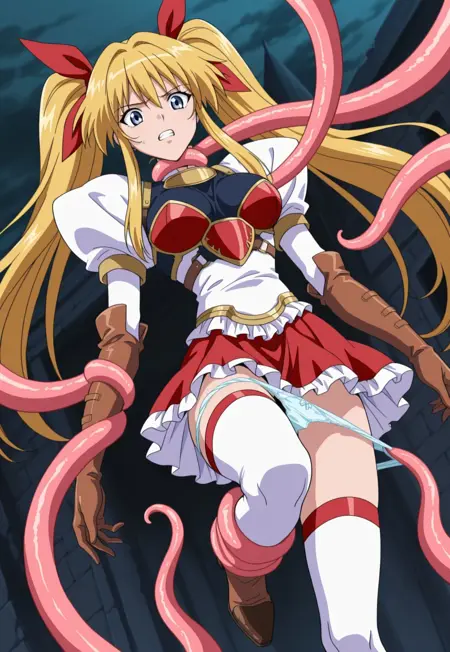• 白シャツ、ふくらはぎ肩、ロングスリーブ、胸当て、赤いフリルスカート、肘ガード、太ももハイ