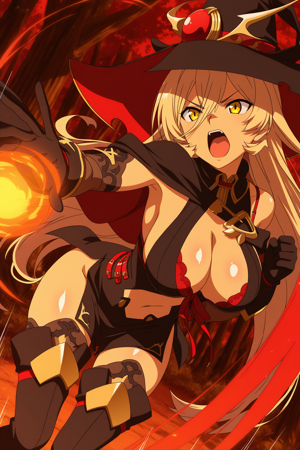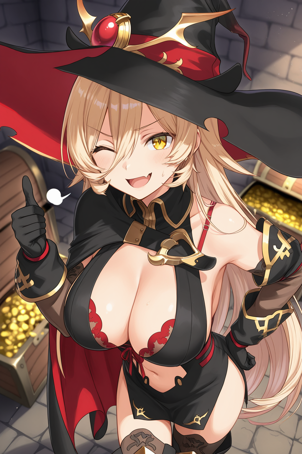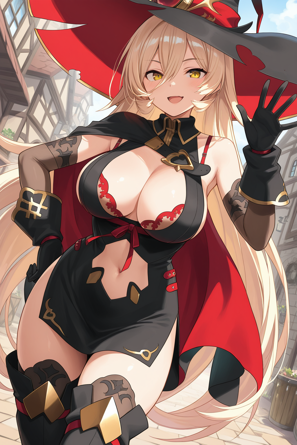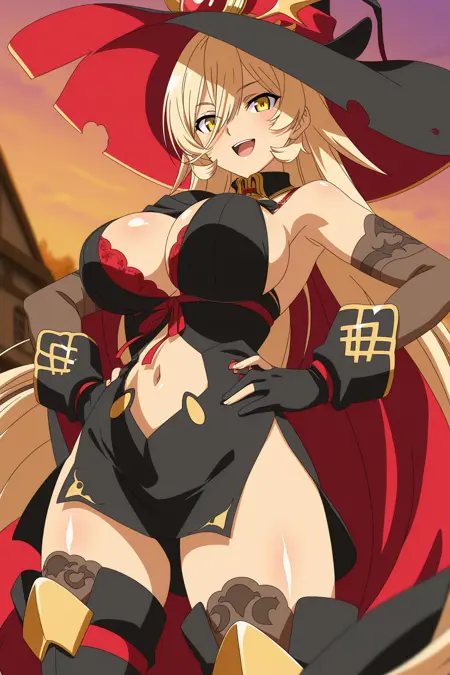 NSNJ, long hair, blonde hair, yellow eyes, sidelocks, large breasts, witch hat, large hat, two-sided cape, short dress, cleavage cutout, navel cutout, sleeveless, red bra, bra strap, cleavage, black gloves, elbow gloves, black thighhighs, thigh boots