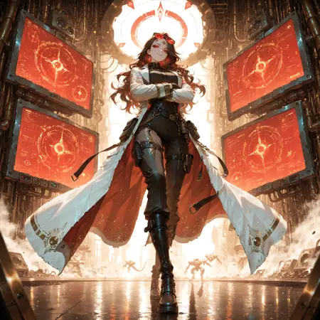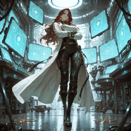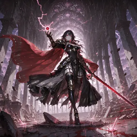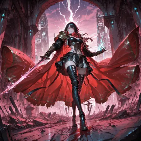 Positive Prompt: masterpiece, best quality, amazing quality, very aesthetic, absurdres, Cinematic angle, dynamic lighting, dark and moody atmosphere, full body, 1girl, solo, dark fantasy, (psionic knight:1.3), dark gold sword in left hand, glowing purple psionic energy aura, white-blonde hair, long hair, high braided twintails, red-violet eyes, sharp intelligent gaze, serious controlled expression, pale skin, subtle sweat on skin, dark brown leather corset with golden plating, black armored skirt with silver outlines, (exposed stomach, defined abs), black thigh high boots, golden pauldrons, armored gloves, dark choker with psi-crystal, intricate gothic patterns, red velvet cloak, (sweat, battle tension), standing on cracked stone pedestal, arm extended forward (sword ready), one leg forward in aggressive stance, looking at viewer, eyes piercing, complex environment, ancient temple ruins, shattered obelisks, floating debris, violet stormy sky, lightning strikes, dramatic perspective from below, highly detailed face, gothic elegance, hauntingly beautiful, intricate details in armor, (blood drips on ground, supernatural atmosphere), cinematic depth, S7mb10T1c, dynamic pose, epic pose, masterpiece, best quality, amazing quality, very aesthetic, absurdres, newest,