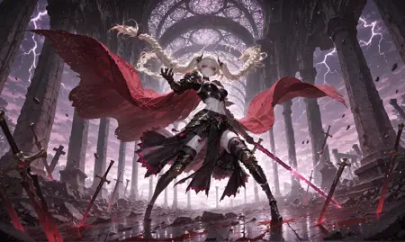 正向提示词: masterpiece, best quality, amazing quality, very aesthetic, absurdres, Cinematic angle, dynamic lighting, dark and moody atmosphere, full body, 1girl, solo, dark fantasy, (psionic knight:1.3), dark gold sword in left hand, glowing purple psionic energy aura, white-blonde hair, long hair, high braided twintails, red-violet eyes, sharp intelligent gaze, serious controlled expression, pale skin, subtle sweat on skin, dark brown leather corset with golden plating, black armored skirt with silver outlines, (exposed stomach, defined abs), black thigh high boots, golden pauldrons, armored gloves, dark choker with psi-crystal, intricate gothic patterns, red velvet cloak, (sweat, battle tension), standing on cracked stone pedestal, arm extended forward (sword ready), one leg forward in aggressive stance, looking at viewer, eyes piercing, complex environment, ancient temple ruins, shattered obelisks, floating debris, violet stormy sky, lightning strikes, dramatic perspective from below, highly detailed face, gothic elegance, hauntingly beautiful, intricate details in armor, (blood drips on ground, supernatural atmosphere), cinematic depth, S7mb10T1c, dynamic pose, epic pose, masterpiece, best quality, amazing quality, very aesthetic, absurdres, newest,
