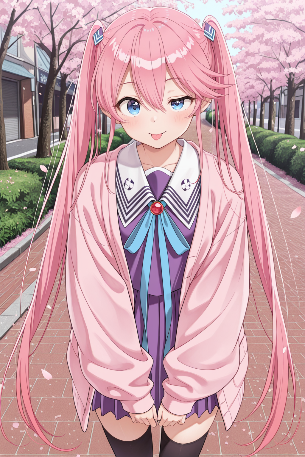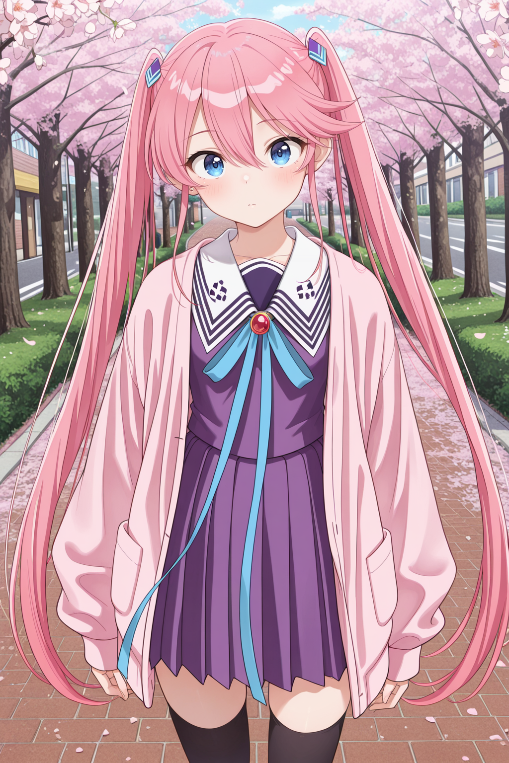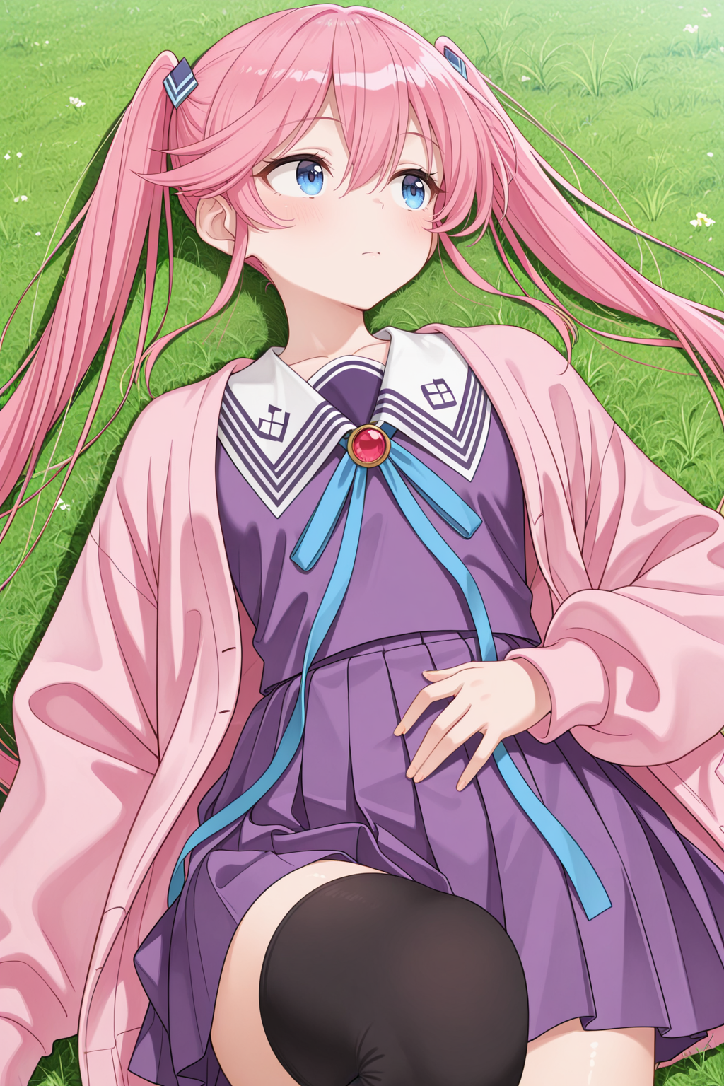 リボン, 青いリボン, ジュエリー, ブローチ, ピンクのカーディガン, 紫のセラフク, プリーツスカート, 紫のスカート, ブラックの thighhighs, 白い靴