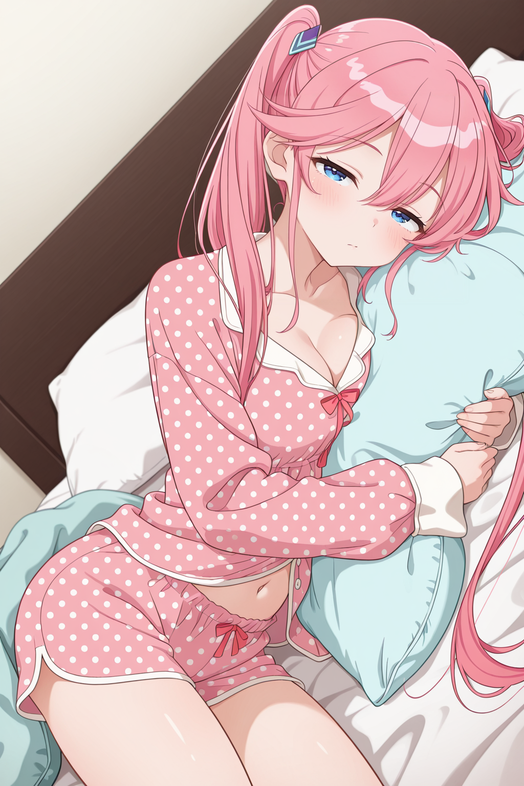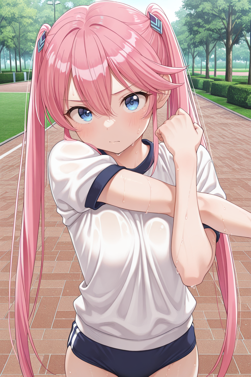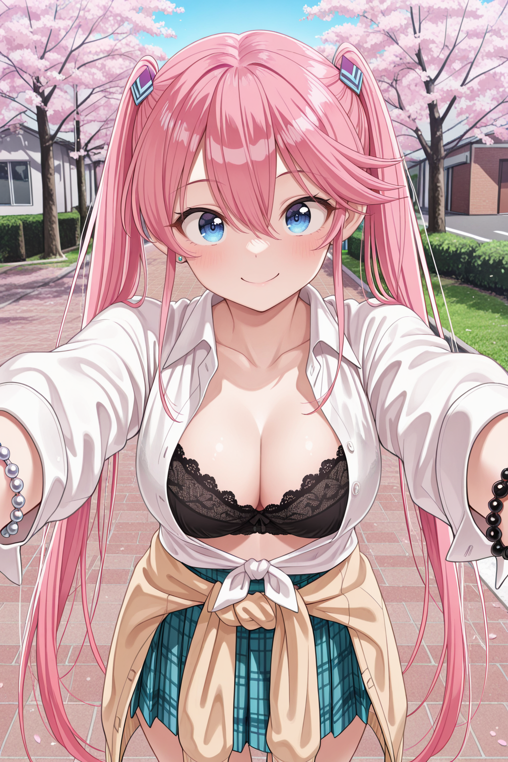 shiunji ouka, 青い目, ピンクの髪, とても長い髪, サイドロックス, 長いサイドロックス, 目の間の髪, ツインテール, 髪飾り