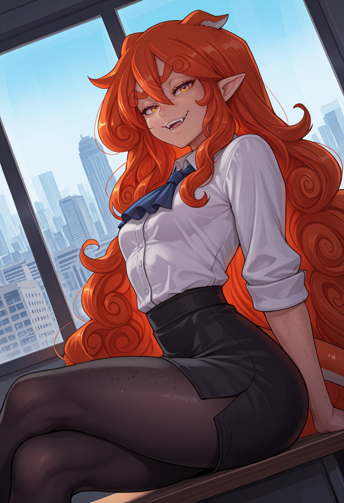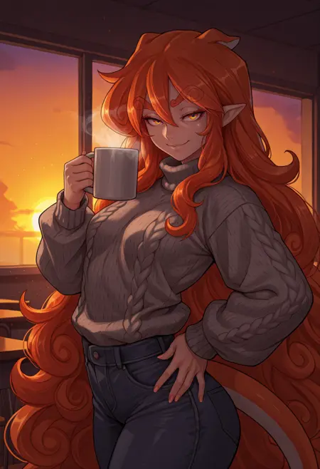 Always needed: "animal ears, pointy ears, curly eyebrows, purple eyes, red eyes, yellow eyes, multicolored eyes, freckles, body freckles, very long hair, curly hair, orange hair, hair between eyes, small breasts, orange tail, toned" always needed for accuracy.