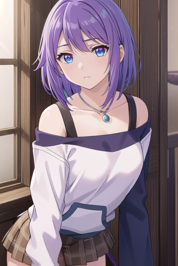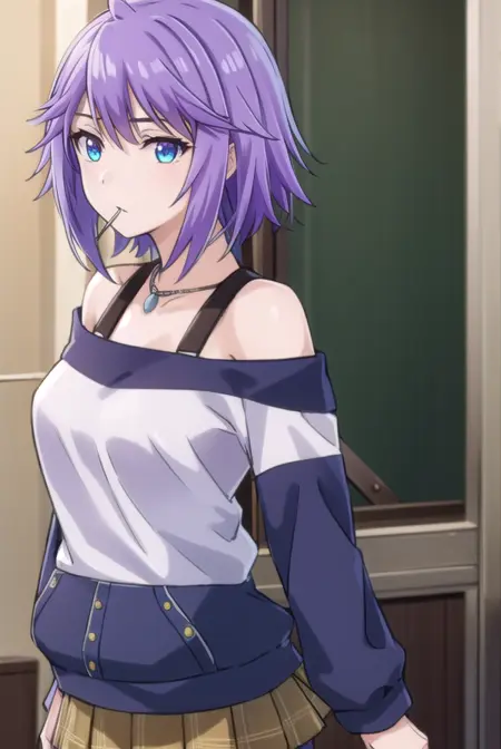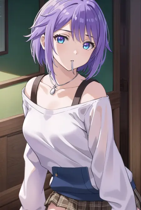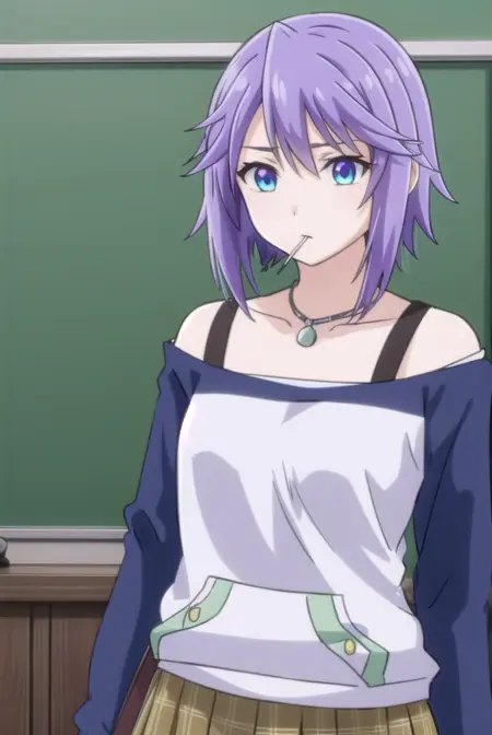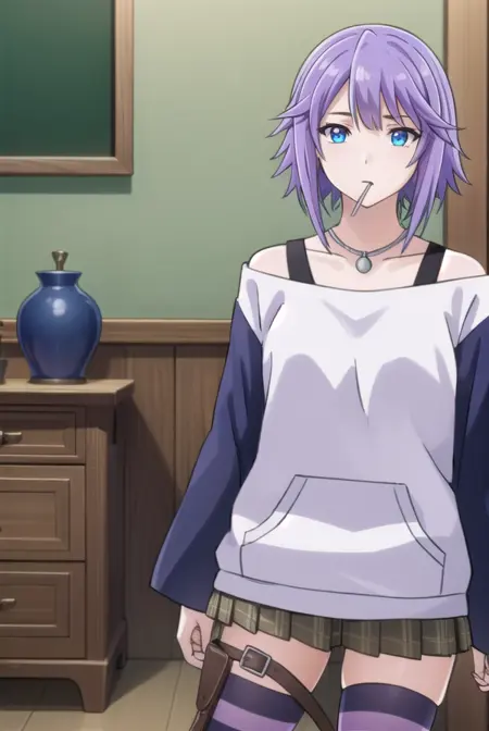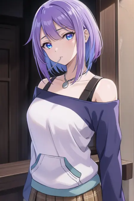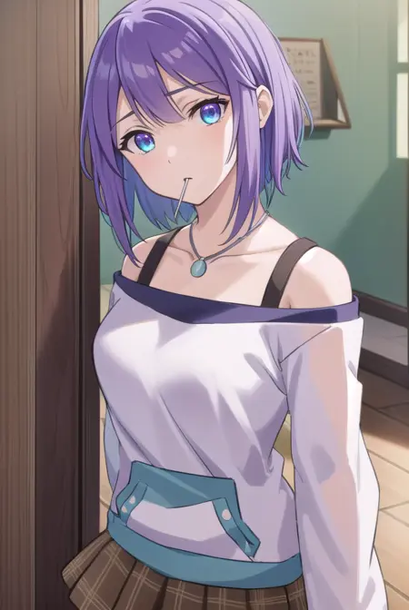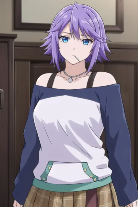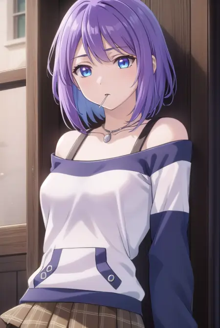 mizore shirayuki, short hair, blue eyes, purple hair, candy, lollipop, (swept bangs:1.5),