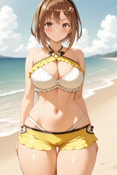 タグ: ryzaswimsuit, ryzaanime, halterneckA, whiteyellow_bikini, frilled_bikiniA, yellow_flower, frill_shorts, yellow_shorts, short_shorts, layered_bikini, panty_straps