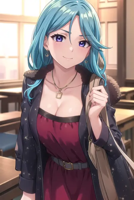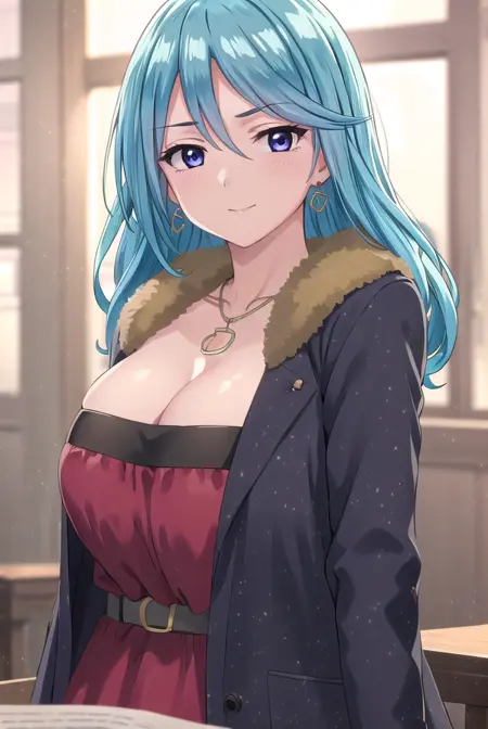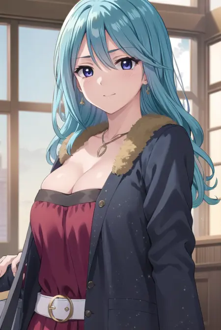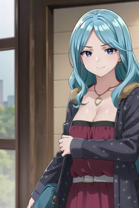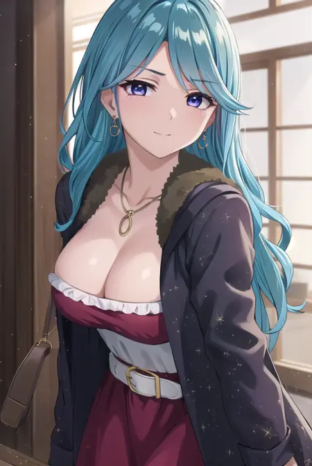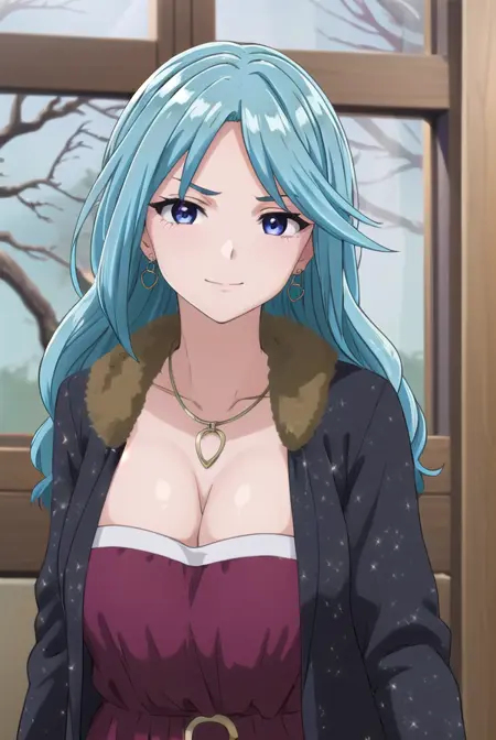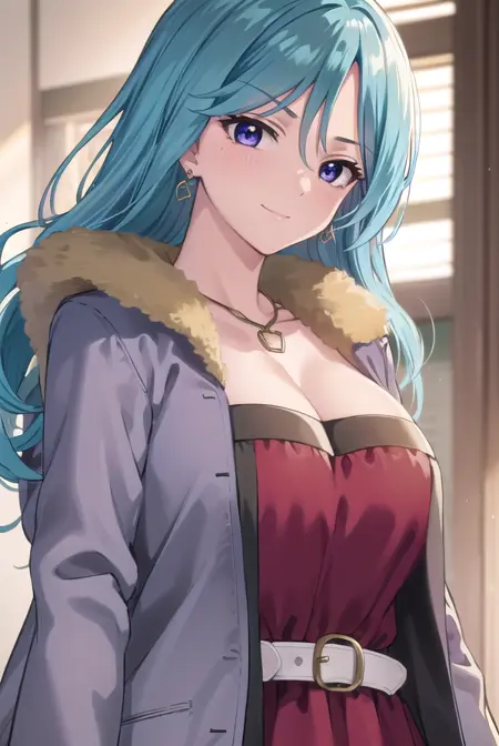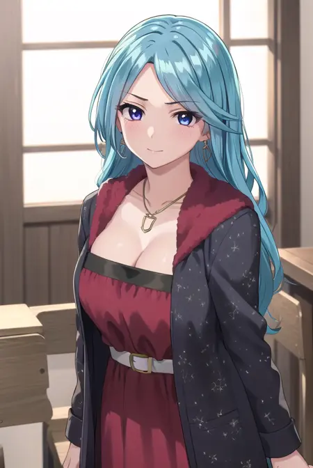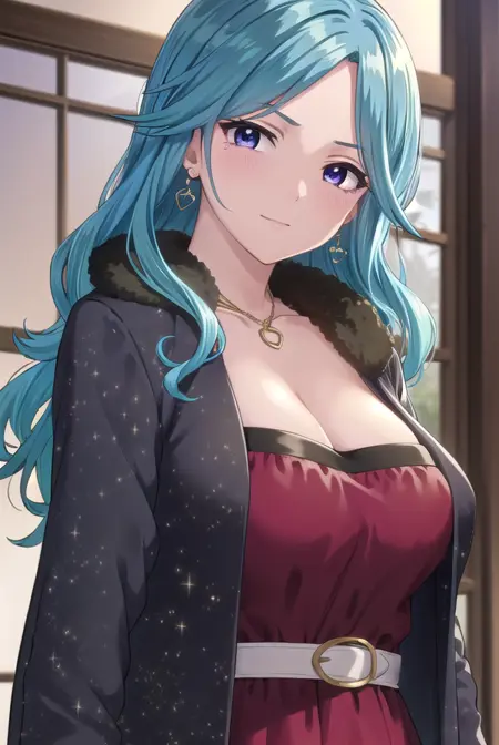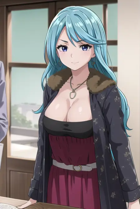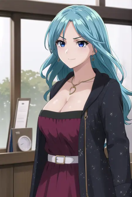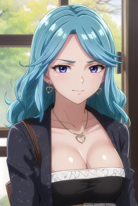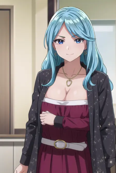 ageha kurono, long hair, blue hair, (purple eyes:1.1), wavy hair, smile, blush, (parted bangs:1.5), mature female,