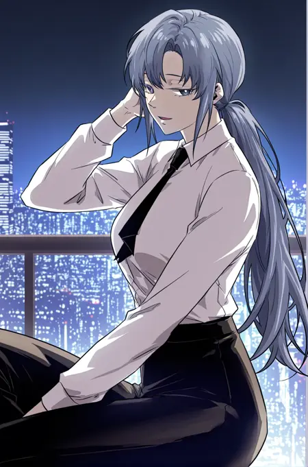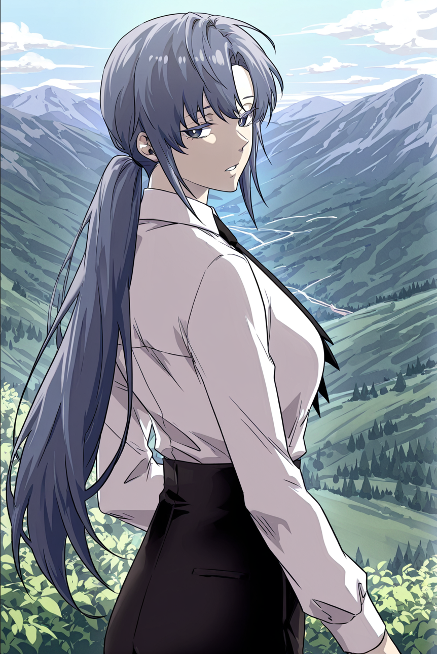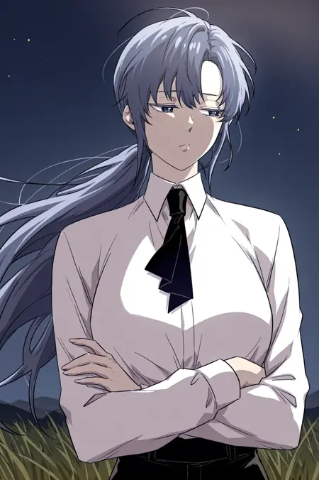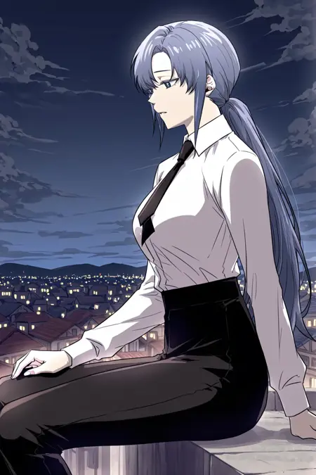Yeonjoo, 1girl, solo, dark blue eyes, blue gray hair, long hair, straight hair, parted bangs, uneven bans, hair between eyes, tied back hair, low ponytai,