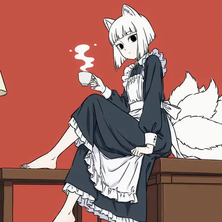 jiuyue,fox girl,animal ears,blunt bangs,white hair,black eyes,bob cut,pale skin,1girl,multiple tails