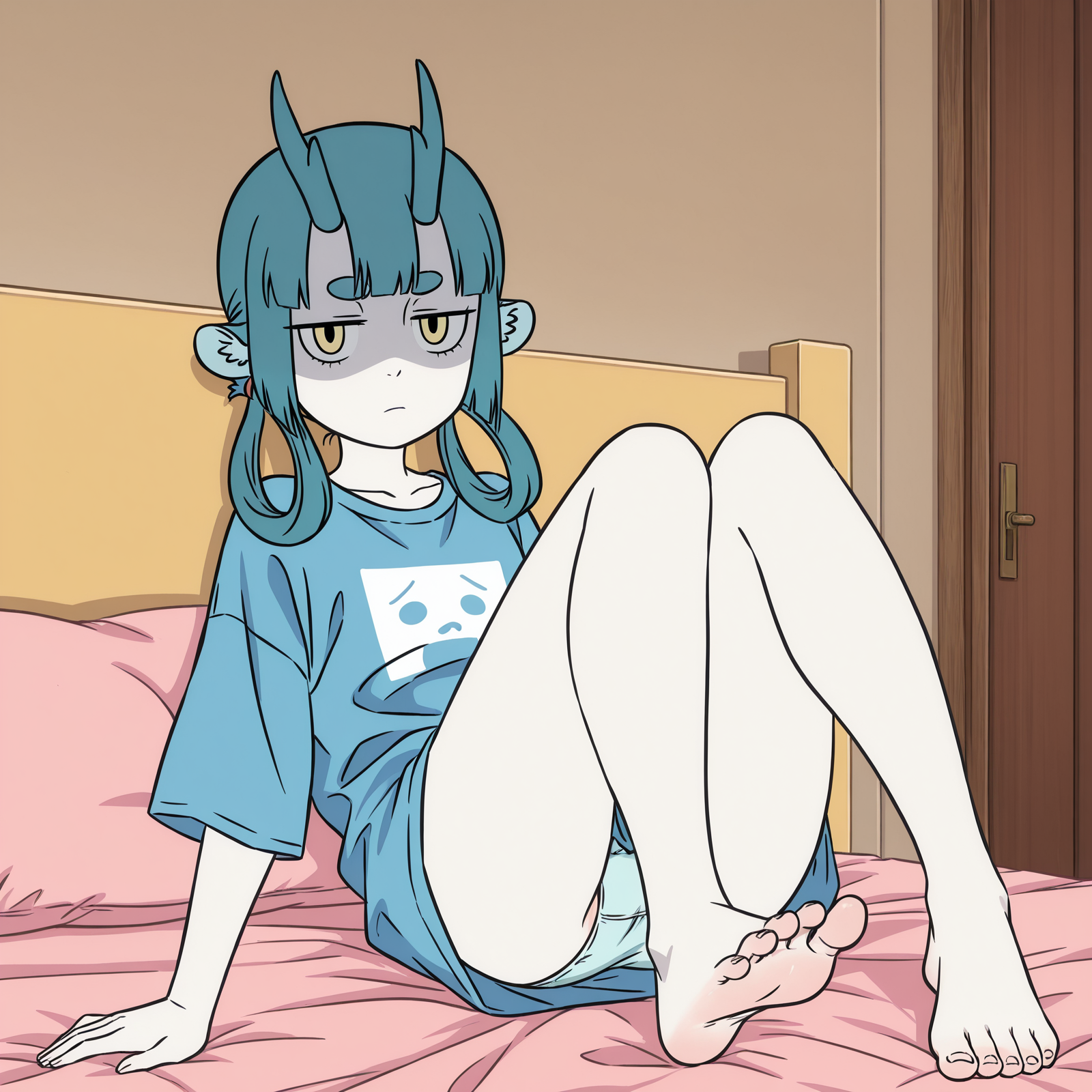 longnv,loong girl,blue hair,yellow eyes,hair rings,sidelocks,oni horns,bangs,pale skin,thick eyebrows,animal ears,1girl