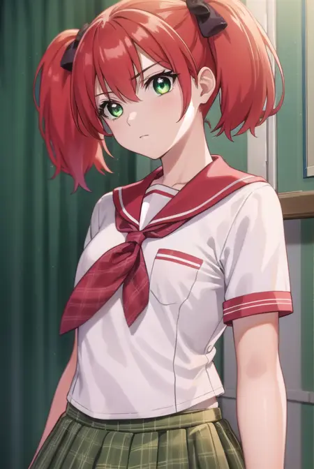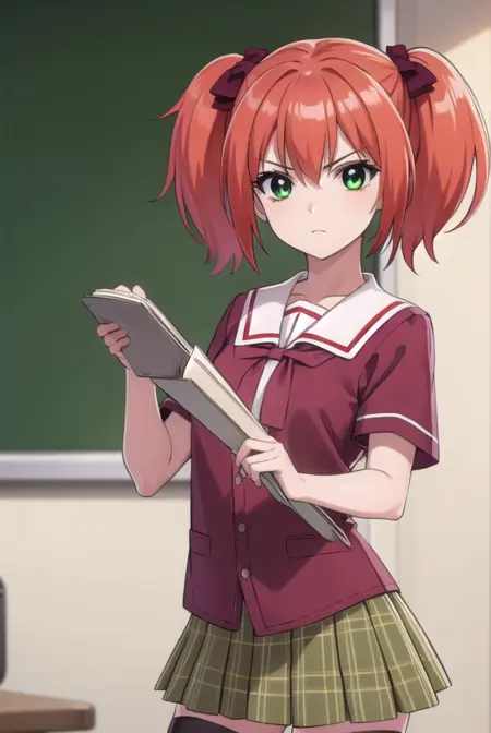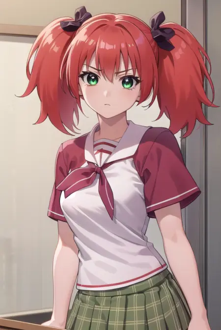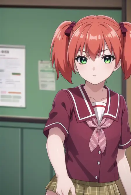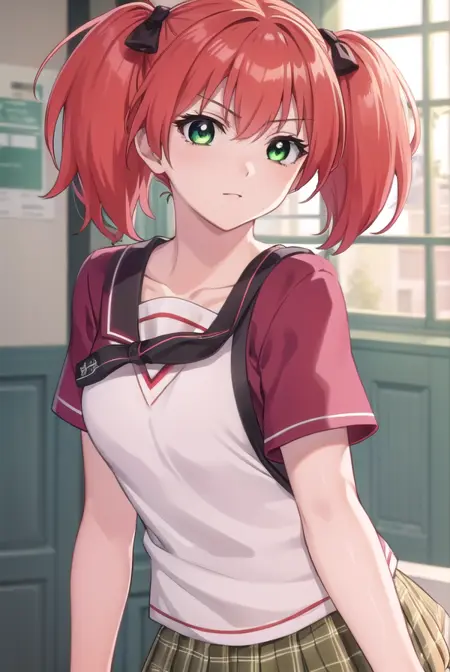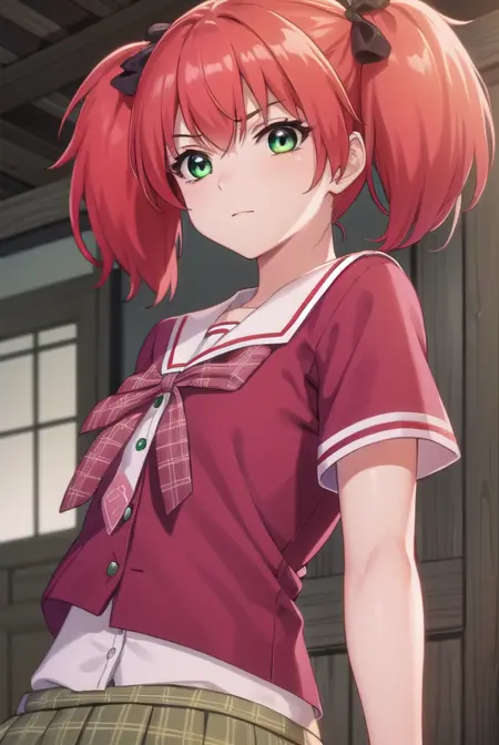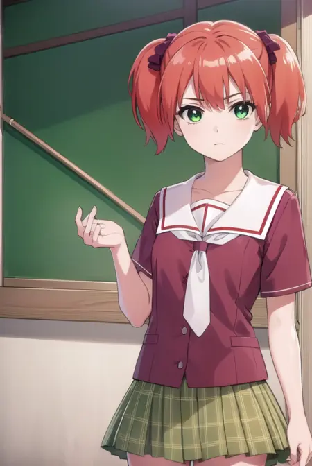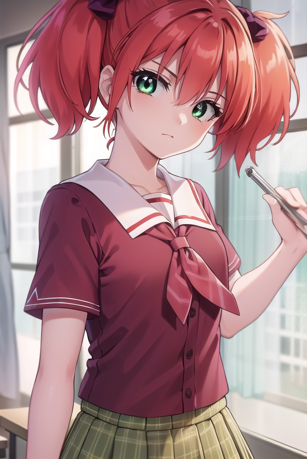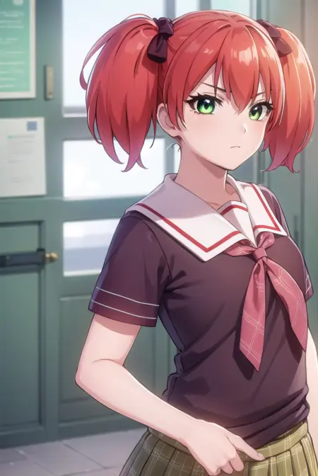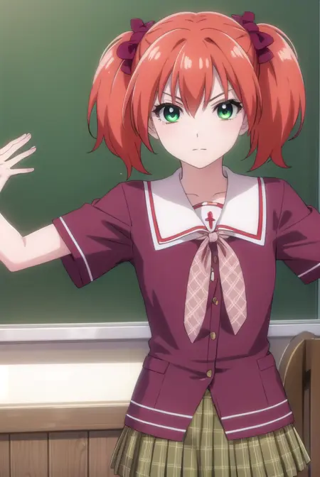 kokoa shuzen, twintails, (green eyes:1.5), red hair, hair bow, short hair,