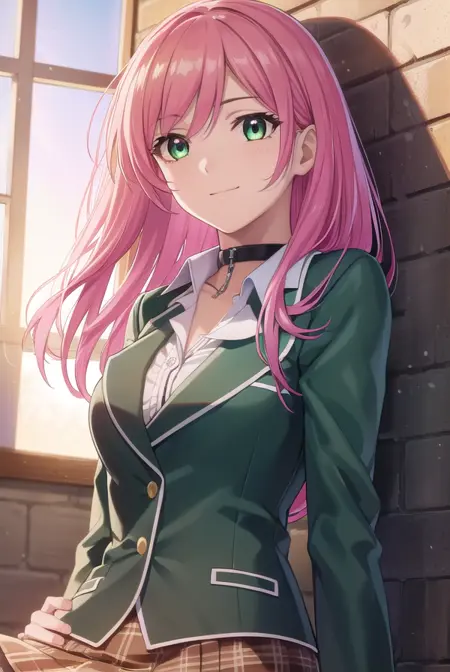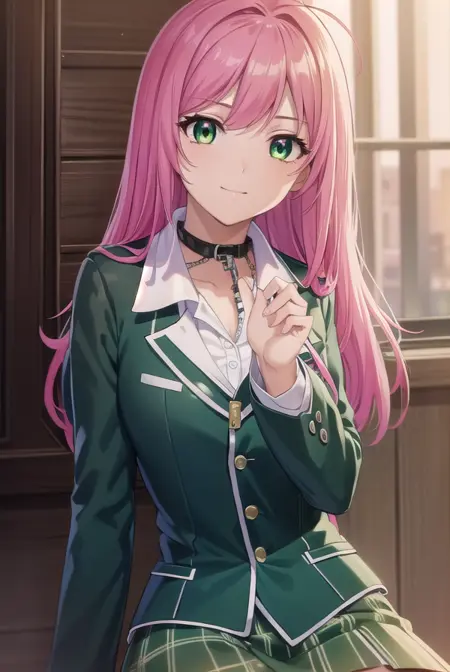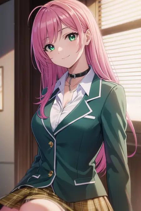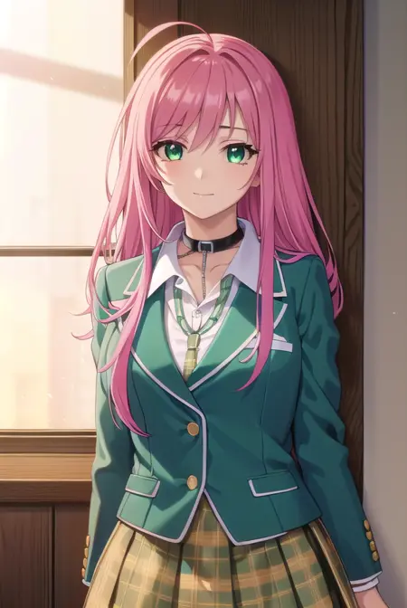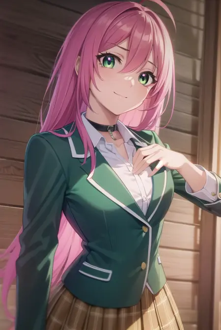 skirt, shirt, school uniform, jacket, pink hair, choker, collar, plaid, plaid skirt, blazer, (green blazer:1.5),