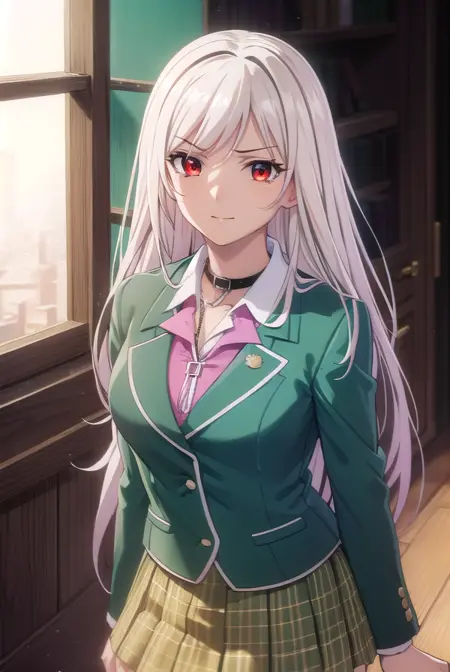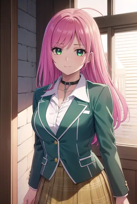スカート、シャツ、学ラン、ジャケット、ピンクの髪、チョーカー、カラー、チェック柄、チェック柄スカート、ブレザー、(緑のブレザー:1.5)、「