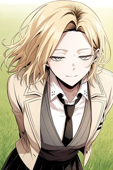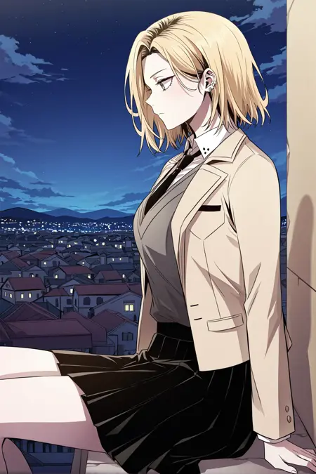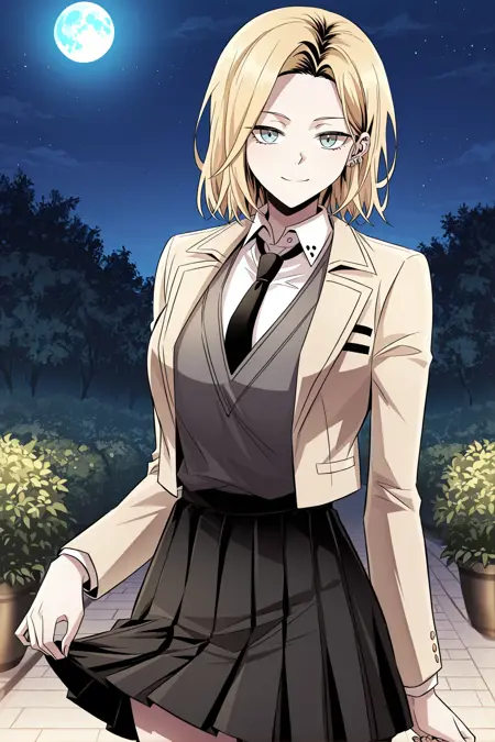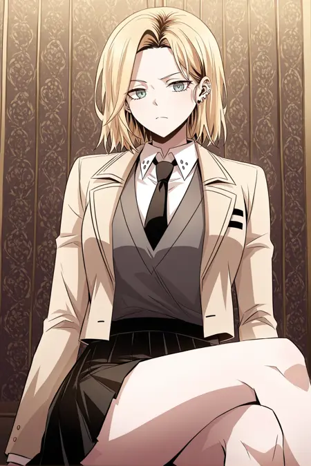 Soyul_outfit2,米色西装外套,带纽扣的西装外套,灰色背心,白衬衫,衬衫领,黑色领带,黑色裙子,百褶裙,