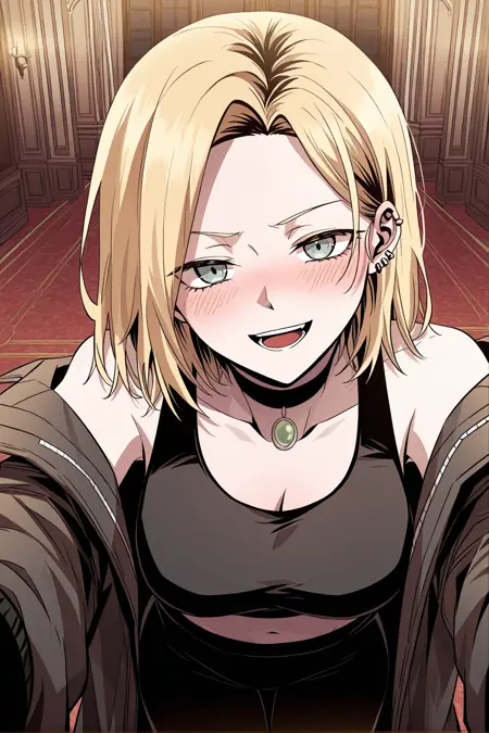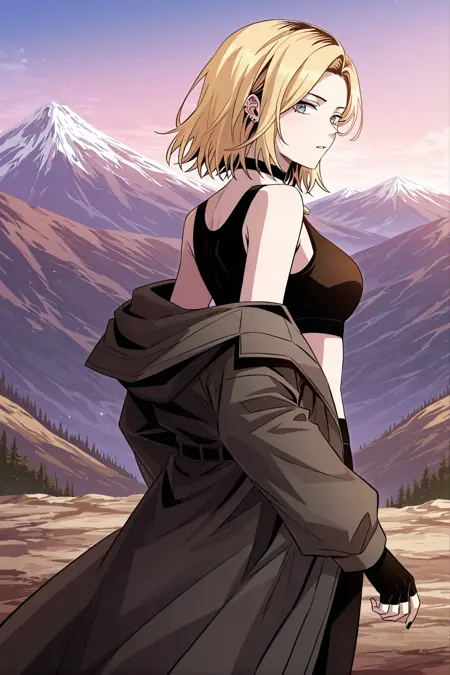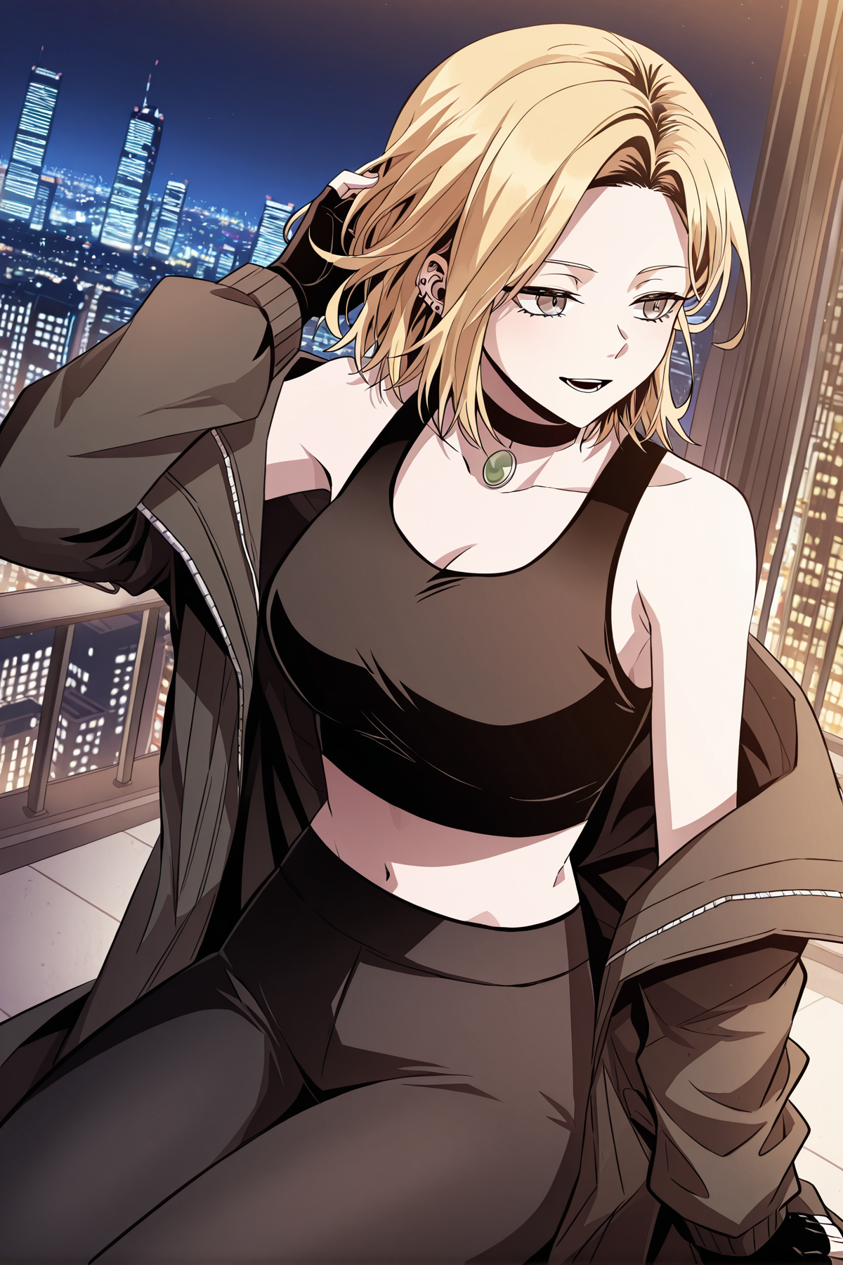 Soyul_outfit1,深棕色外套,敞开式外套,长外套,露肩外套,黑色运动内衣,露腹,黑色裤子,紧身裤,黑色手套,露指手套,黑色项圈,吊坠项圈,