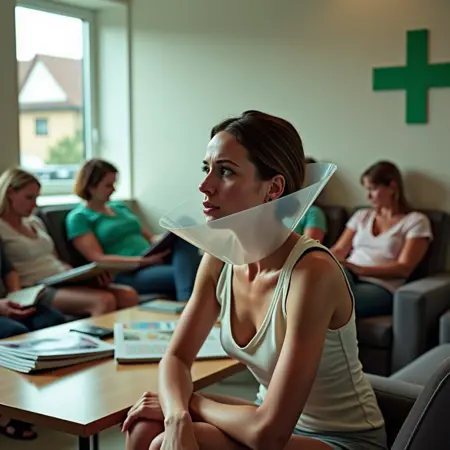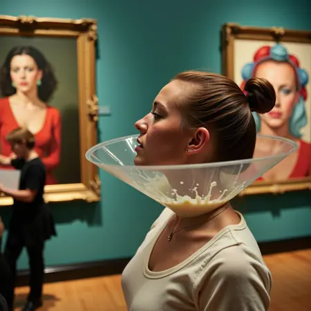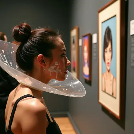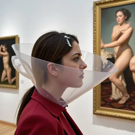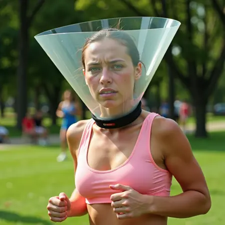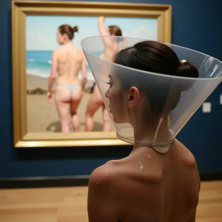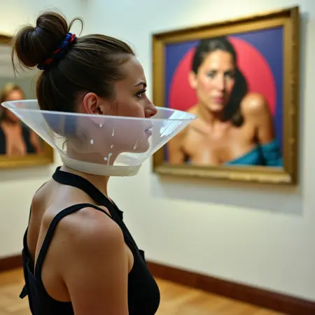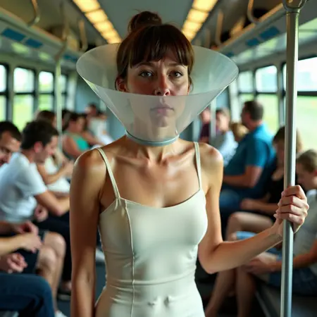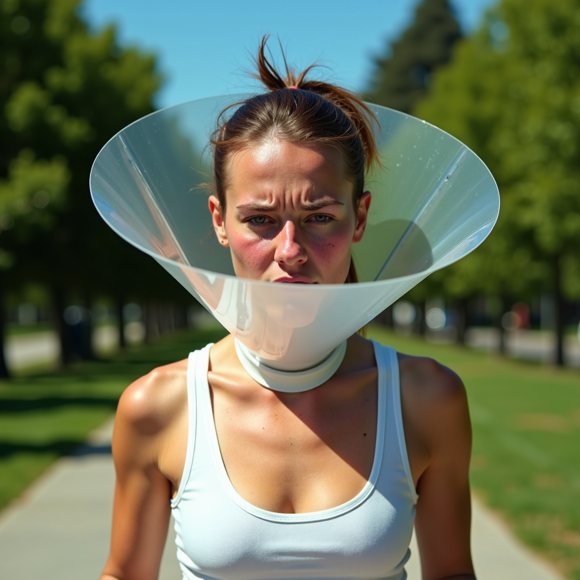 Typical prompt: she wears a transparent cone of shame, cone_of_shame fully encloses her neck and head and face, the cone_of_shame is closed tight around her neck, the long cone_ of_shame protrudes so far forward that her view is blocked