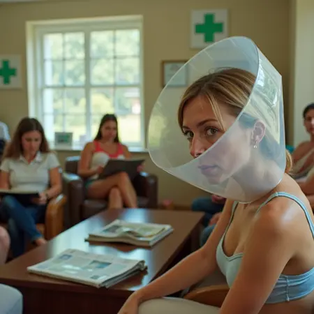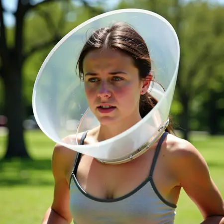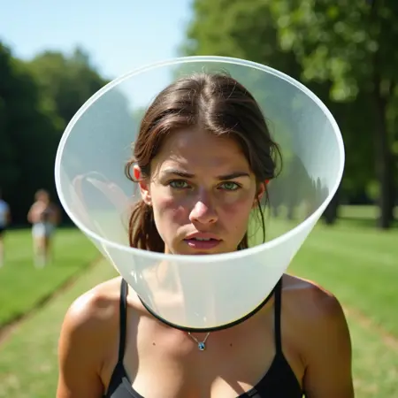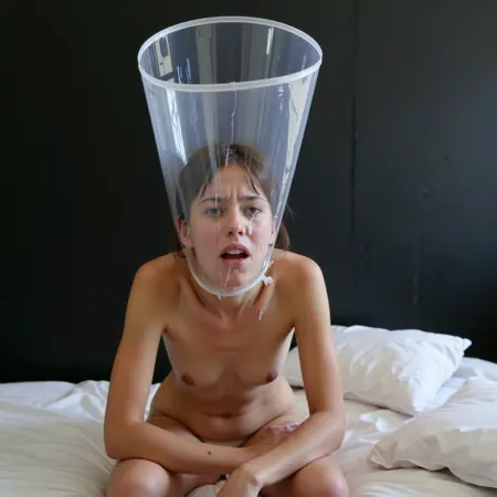 一般的なプロンプト:彼女は透明なシャムの円錐を着用しており、シャムの円錐は首と頭、顔を完全に包み込み、首の周りにきっちりと閉じられており、長いシャムの円錐が前方に大きく突き出て、視界を遮っている