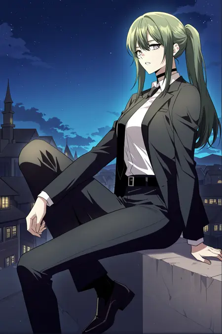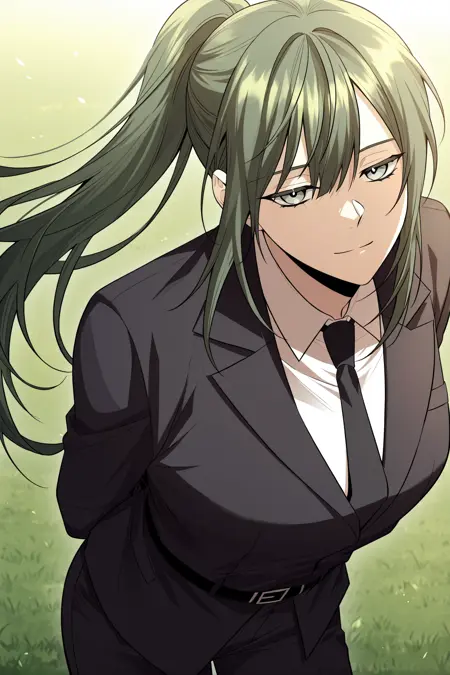 Jiyeon, 1girl, solo, dusty sage gray eyes, green hair, long hair, straight hair, long bangs, uneven bangs, hair between eyes, long sidelocks, high ponytail,