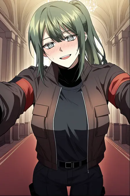 Jiyeon_outfit1, dark brown jacket, military jacket, long sleeves, high collar jacket, dark shirt, black undershirt, turtleneck shirt, black belt, red armband, black gloves, fingerless gloves, black pants, tactical pants, black boots,