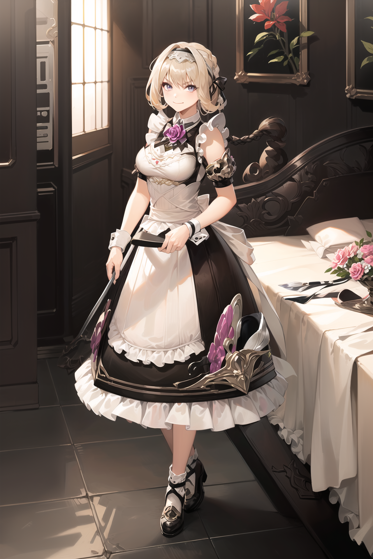 그녀의 주요 트리거 단어는 kr priscilla이며, 관련된 추가 태그로는: 메이드, 메이드 앞치마, 앞치마, 머리띠, 중간 길이 머리, 꽃, 긴 땋은 머리가 있습니다.