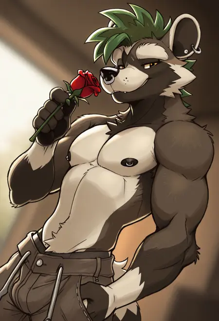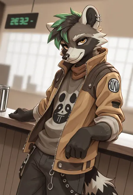 Illustrious: best quality, amazing quality, very aesthetic, absurdres, newest, ru7u5, fortnite, furry, furry male, 1boy, solo, tail, green hair, jacket, muscular, piercing, looking at viewer, pectorals, ...your tags...