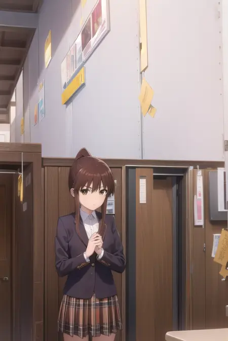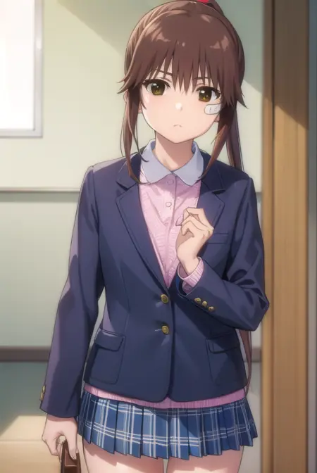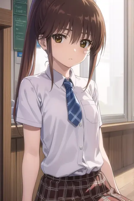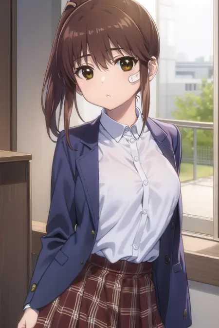 riko suminoe, 긴 머리, 갈색 머리, (갈색 눈:1.5), 포니테일, 반창고, 얼굴에 반창고, 측면 머리카락,