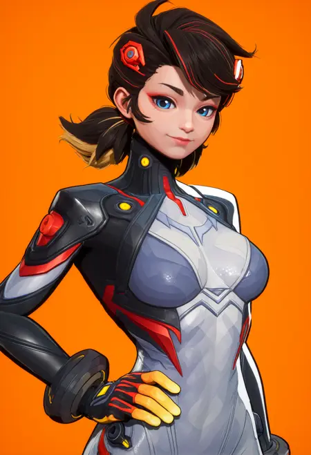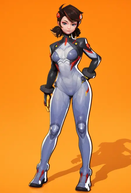 penimr, 3d, brown hair, plugsuit, grey bodysuit, pilot suit, short hair, skin tight, multicolored hair, blue eyes, low twintails,streaked hair,yellow gloves