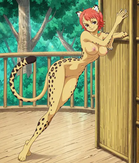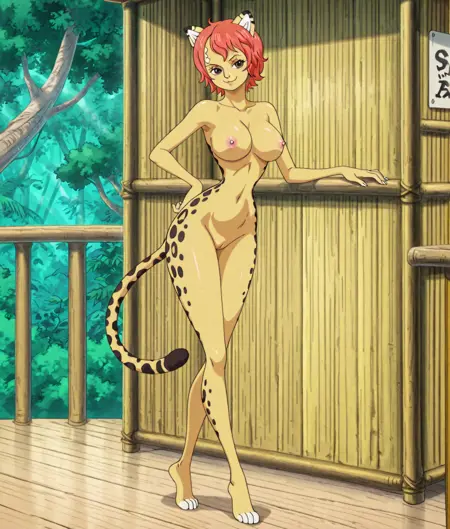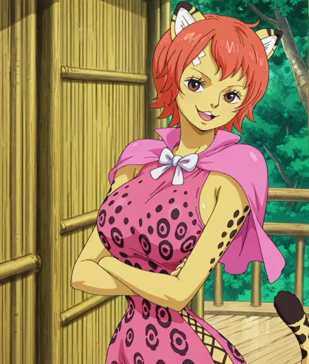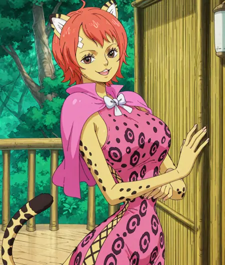 | トレーニングワード | jaguar_girl (one piece), yellow fur, jaguar ears, jaguar girl, jaguar tail, flat color, toon (style), red hair, short hair,medium breasts, narrow waist,コピーしました! pink capelet, pink dress, side-tie dress, leopard print dress, brown eyes, open mouth, white bow,コピーしました! |