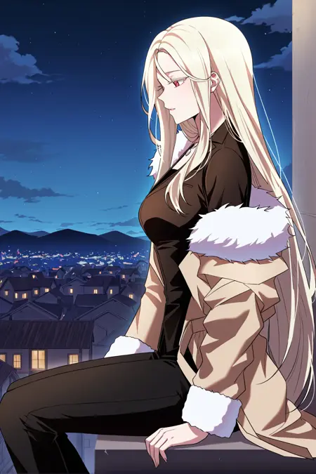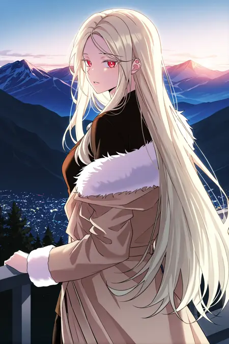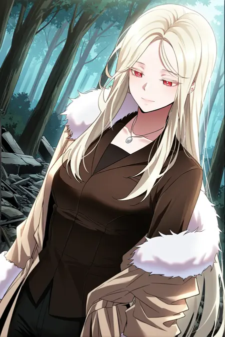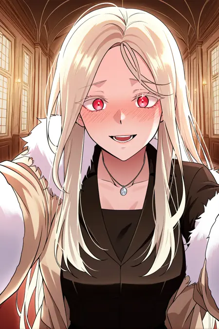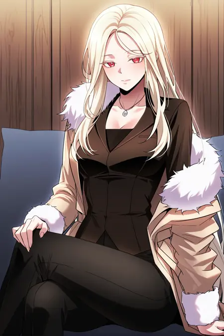 Jihyeon, 1girl, solo, red eyes, light blonde hair, long hair, long bangs, side parted bangs, hair between eyes, long sidelocks, hair strand between eyes,