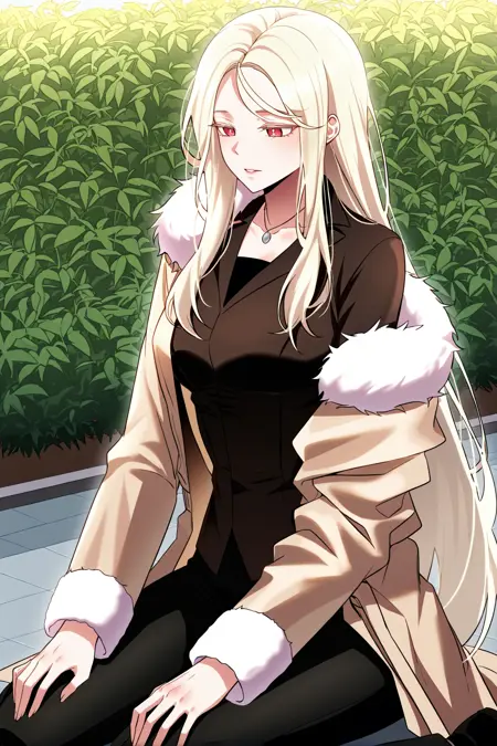 Jihyeon_outfit, tan coat, coat on one shoulder, fur collar, long sleeves, fur cuffs, black blazer, black undershirt, black pants, silver pendant necklace