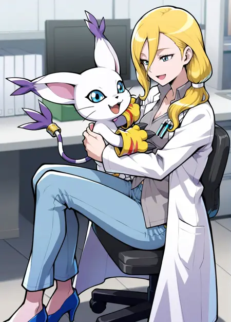 monica_simmons, blonde hair, long hair, blue eyes, lab coat, grey shirt, blue pants, jeans, blue high heels
