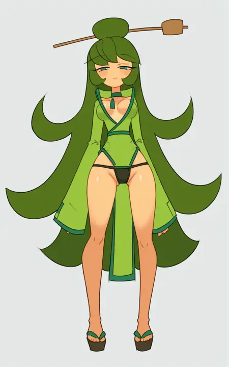 **Reinforcement Tags: **green hair, long hair, very long hair, hair bun, single hair bun, green eyes, half-closed eyes