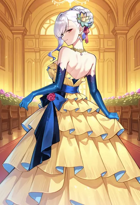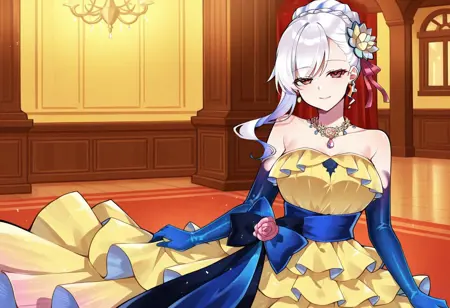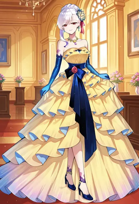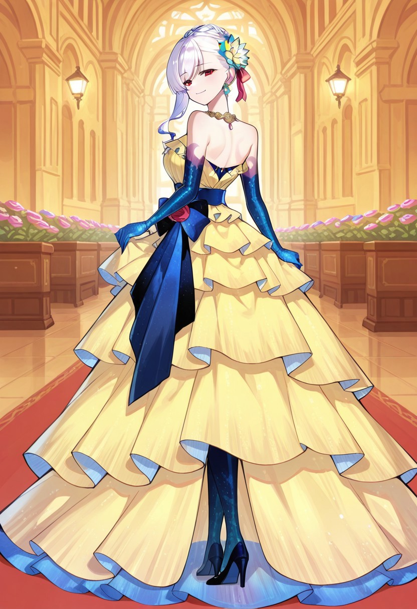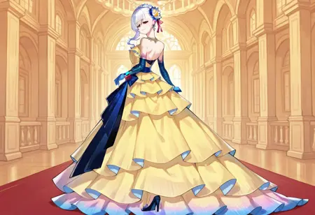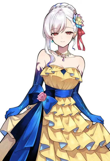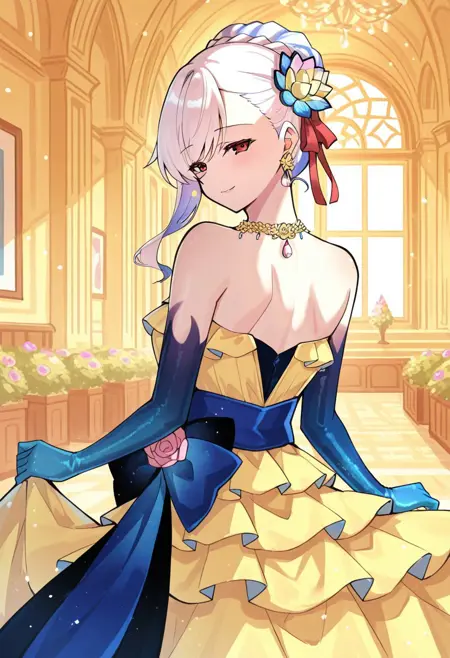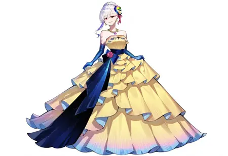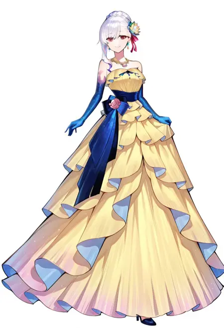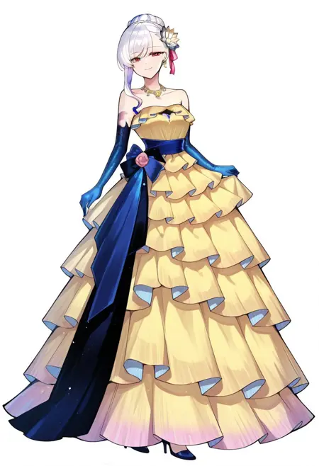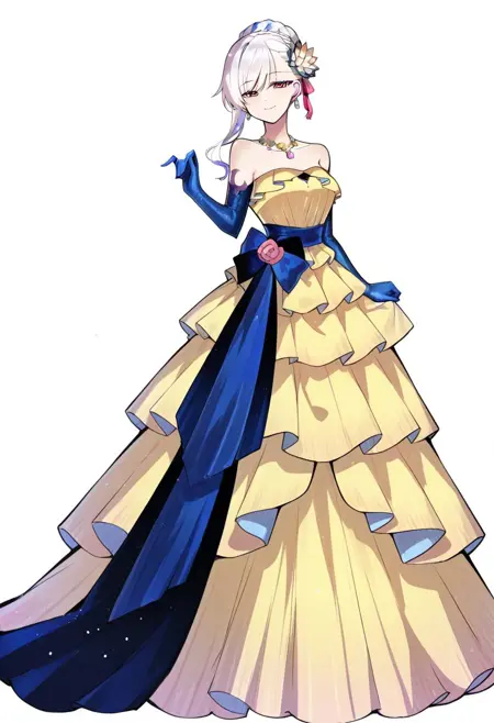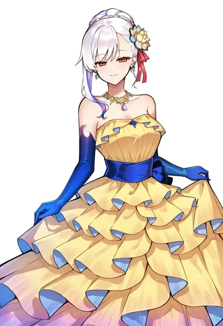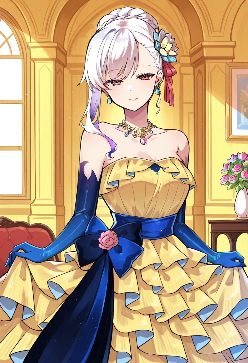jewelry, necklace, earrings, collarbone, bare shoulders, gown, strapless dress, long dress, frills, frilled dress, two-tone dress, yellow dress, blue belt,