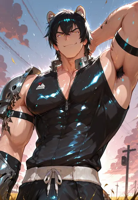 Broca, black hair, animal ears, arm tattoo, yellow eyes, armor