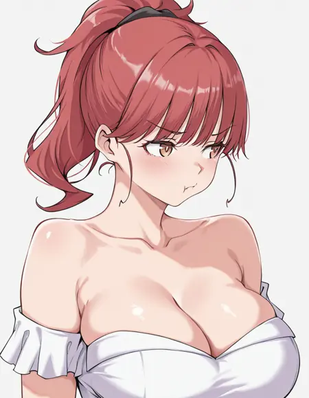 Trained prompts: 1girl, akemighost, akemichan, ponytail, bangs, bare shoulders, large breasts, cleavage, white strapless dress