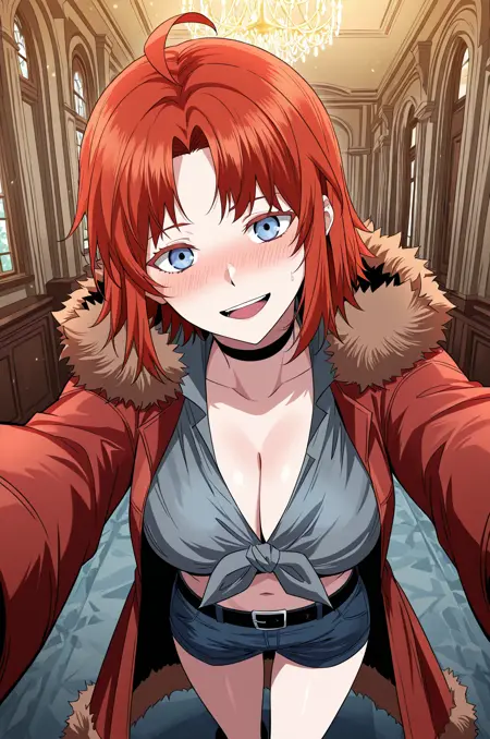 Camilla_outfit1, red coat, fur collar, coat open, grey top, knotted top, crop top, midriff, blue shorts, black belt, black choker, black boots