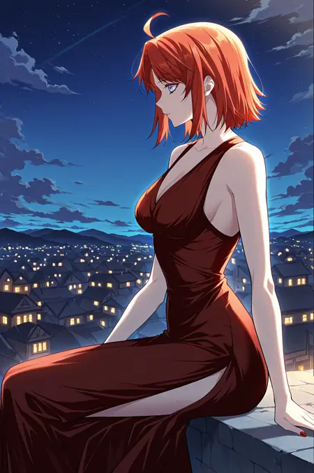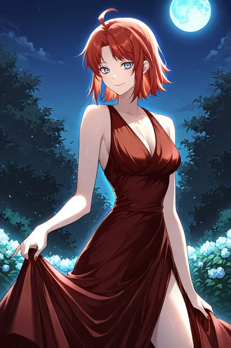 Camilla, 1girl, solo, ice blue eyes, red hair, short hair, layered bangs, uneven bangs, parted bangs, hair between eyes, ahoge, sidelocks,