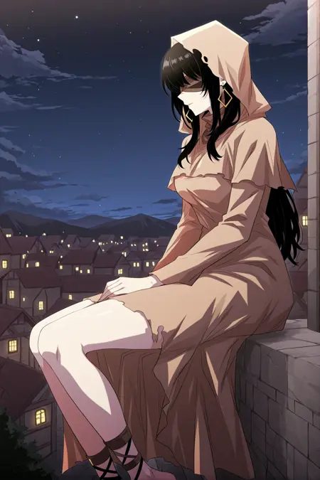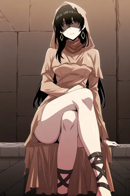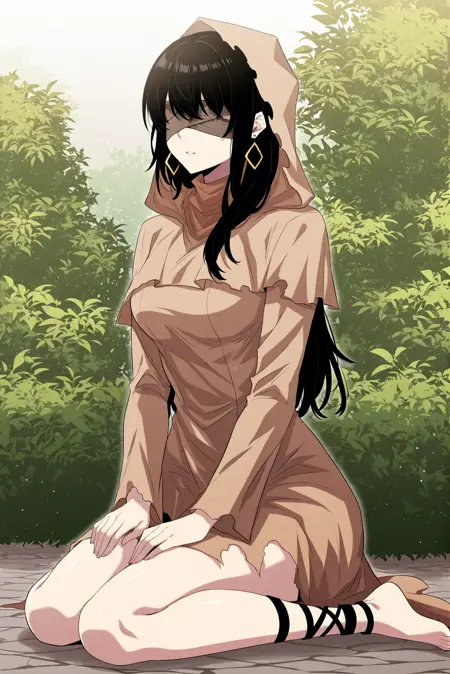 诺恩服装,棕色连帽长袍,帽子抬起,破损长袍,长袖,层叠长袍,棕色围巾,交叉脚踝绑带,赤足