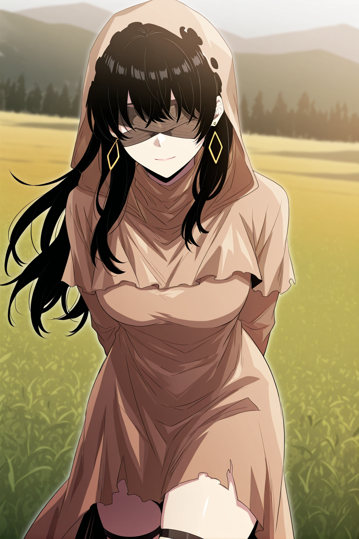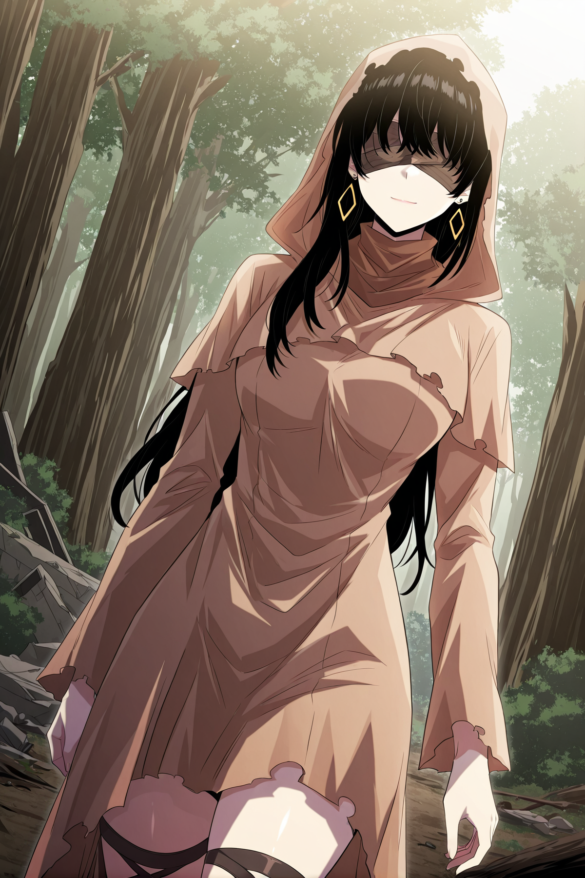 诺恩,1个女孩,单独,黑发,长发,不齐刘海,头发遮住眼睛,散开的头发,金色耳环,眼罩,