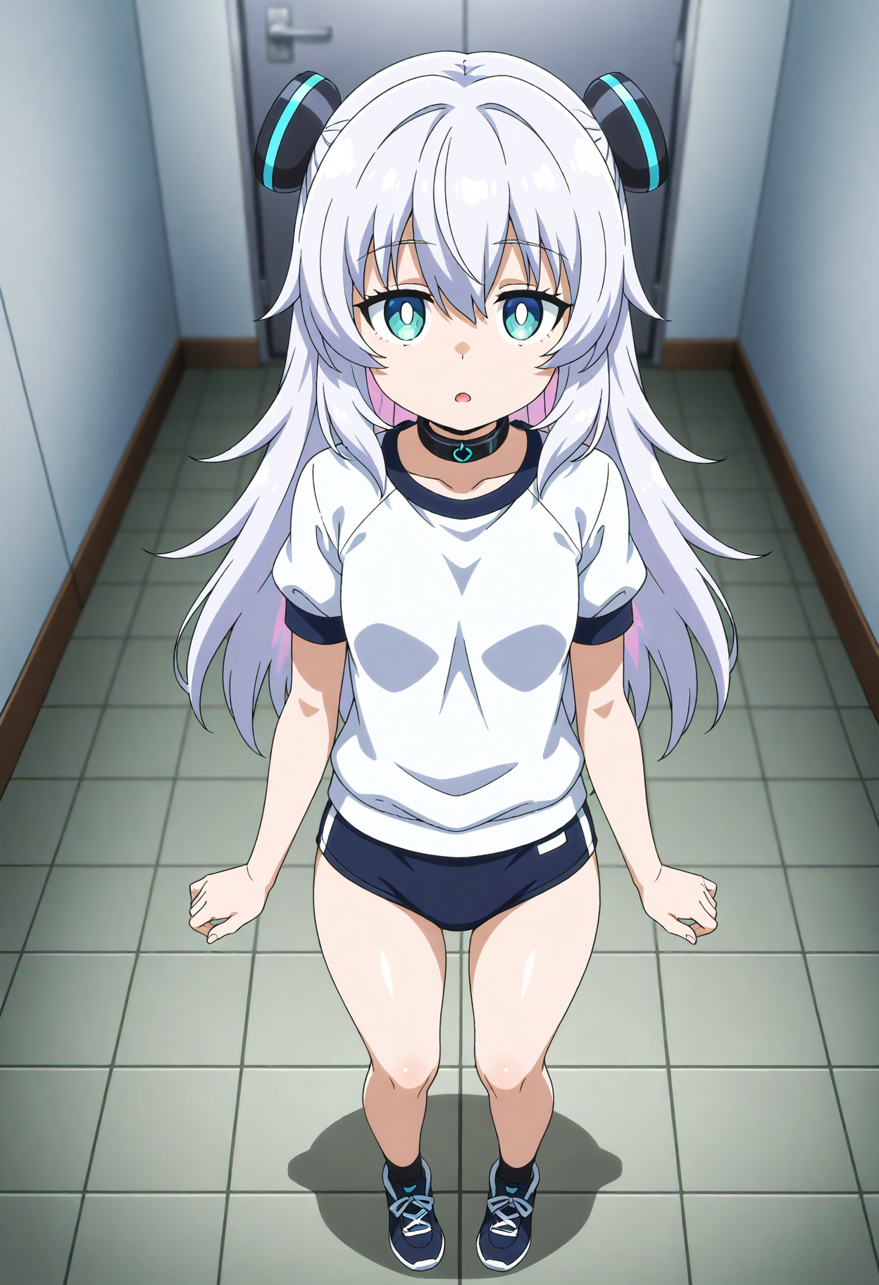 almachan, 1girl, solo, android, robot girl, white hair, gradient hair, purple hair tips, long hair, blunt bangs, hair between eyes, blue eyes, looking at viewer,