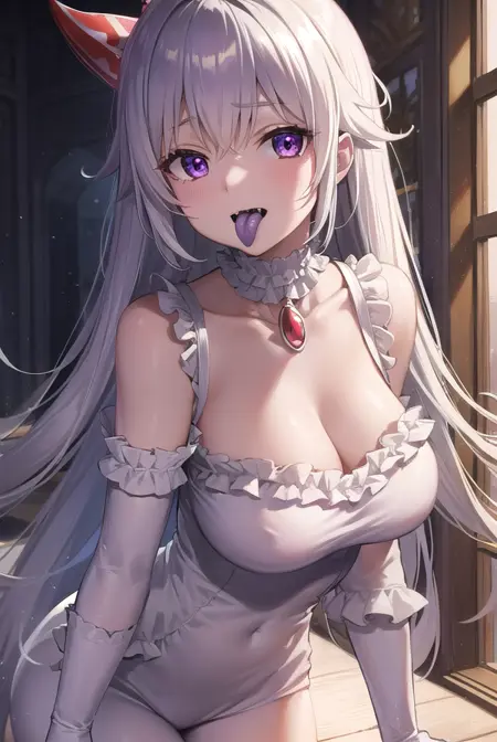 princess king boo, crown, fangs, long hair, (purple eyes:1.1), sharp teeth, super crown, teeth, tongue, (tongue out:1.5), pale skin,
