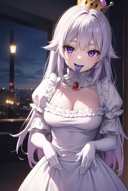princess king boo,王冠,獠牙,长发,(紫色眼睛:1.1),尖牙,超王冠,牙齿,舌头,(吐舌:1.5),苍白皮肤,