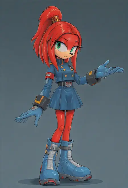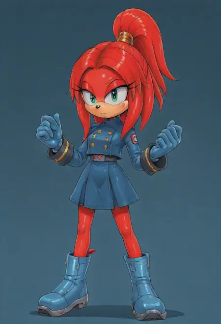 Gae-Na The Echidna, Mobian echidna, red fur, red hair, red dreadlocks, red ponytail, peach snout, green right eye, cybernetic left eye, blue dress uniform, blue gloves, blue boots,