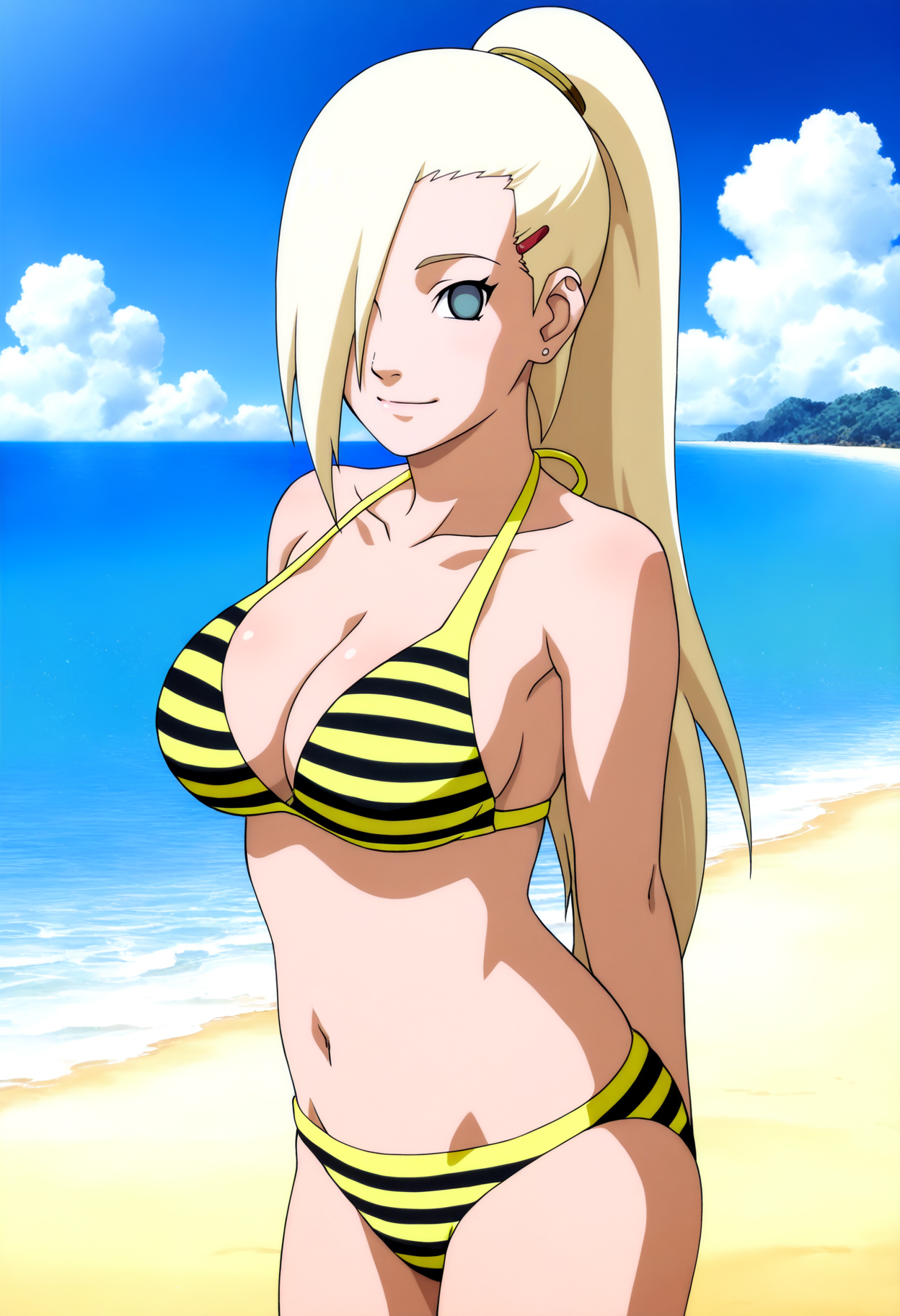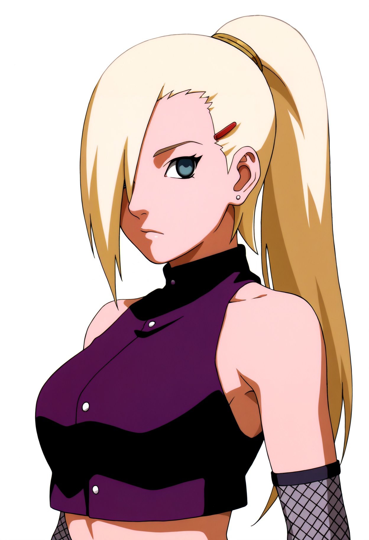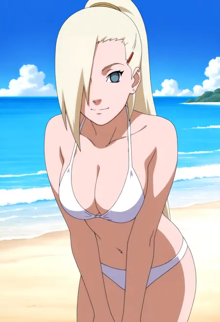 Basic prompts : 1girl, yamanaka ino, blonde hair, hair over one eye, long hair, ponytail, blue eyes, hairclip