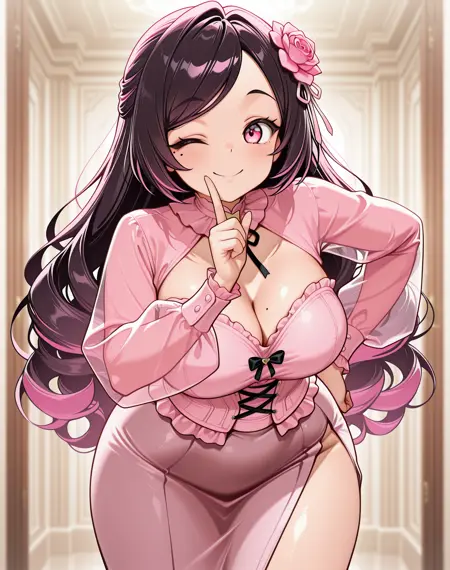 | Trained Words | RieBase, himemiya rie, dark hair, bangs, long hair, twintails, pink hair ends, ribbon, hair ornament, hair ribbon, pink eyes, mole under eye, medium breasts, floating tiara, lace choker, cleavage cutout, lace trim black undershirt, white frilled blouse, shirt overhang, white ribbon, pink plaid skirt, pleated skirt, pink thighhighs, white thigh strap, white shoes, black ribbon shoes,Copied! cropped beige yellow cardigan, open jacket, sleeves past wrists, single pink armband,Copied! RieRoyal, dark hair, very long hair, swept bangs, pink hair ends, hair flower, large breasts, high collar, jewelry, cleavage cutout, pink dress, pink cross-laced corset, see-through long sleeves, side slit, frilled long dress, high heelsCopied! RieDate, dark hair, pink eyes, twintails, pink hair ends, black ribbons, large breasts, high collar, pink shirt, frilled shirt, long sleeves, shoulder cutout, black high-waist skirt, thigh straps, bare legs, black shoes,Copied! |