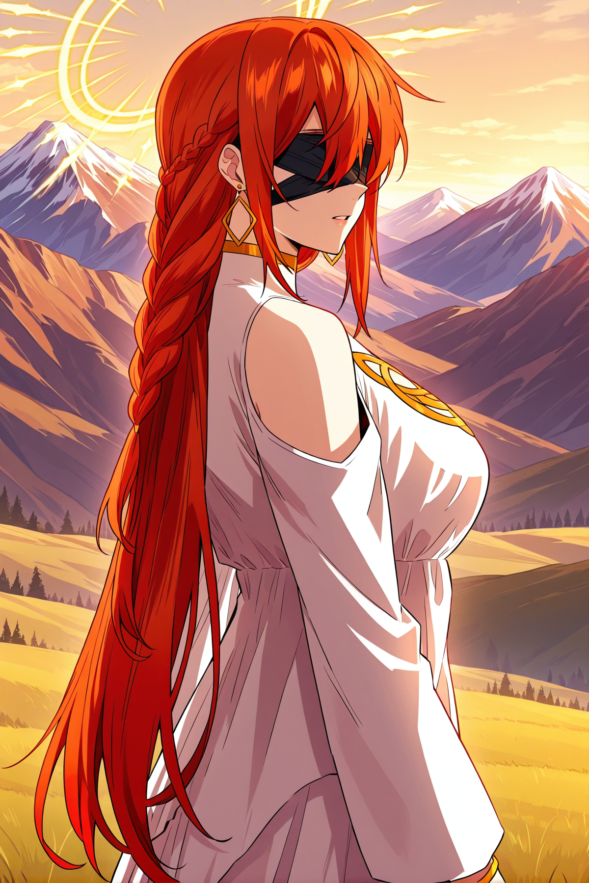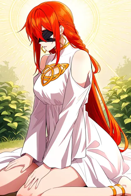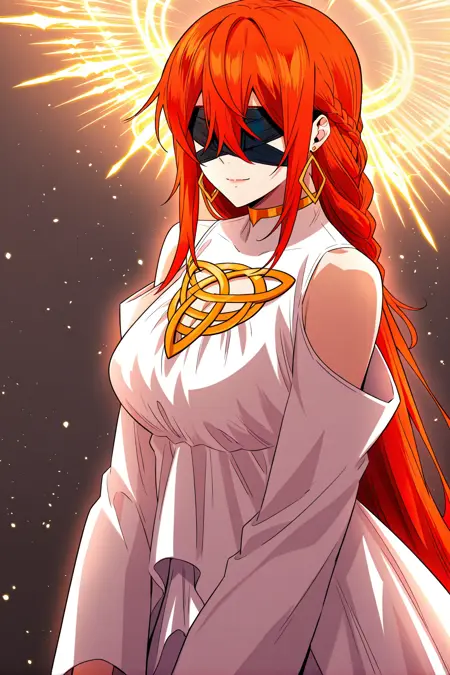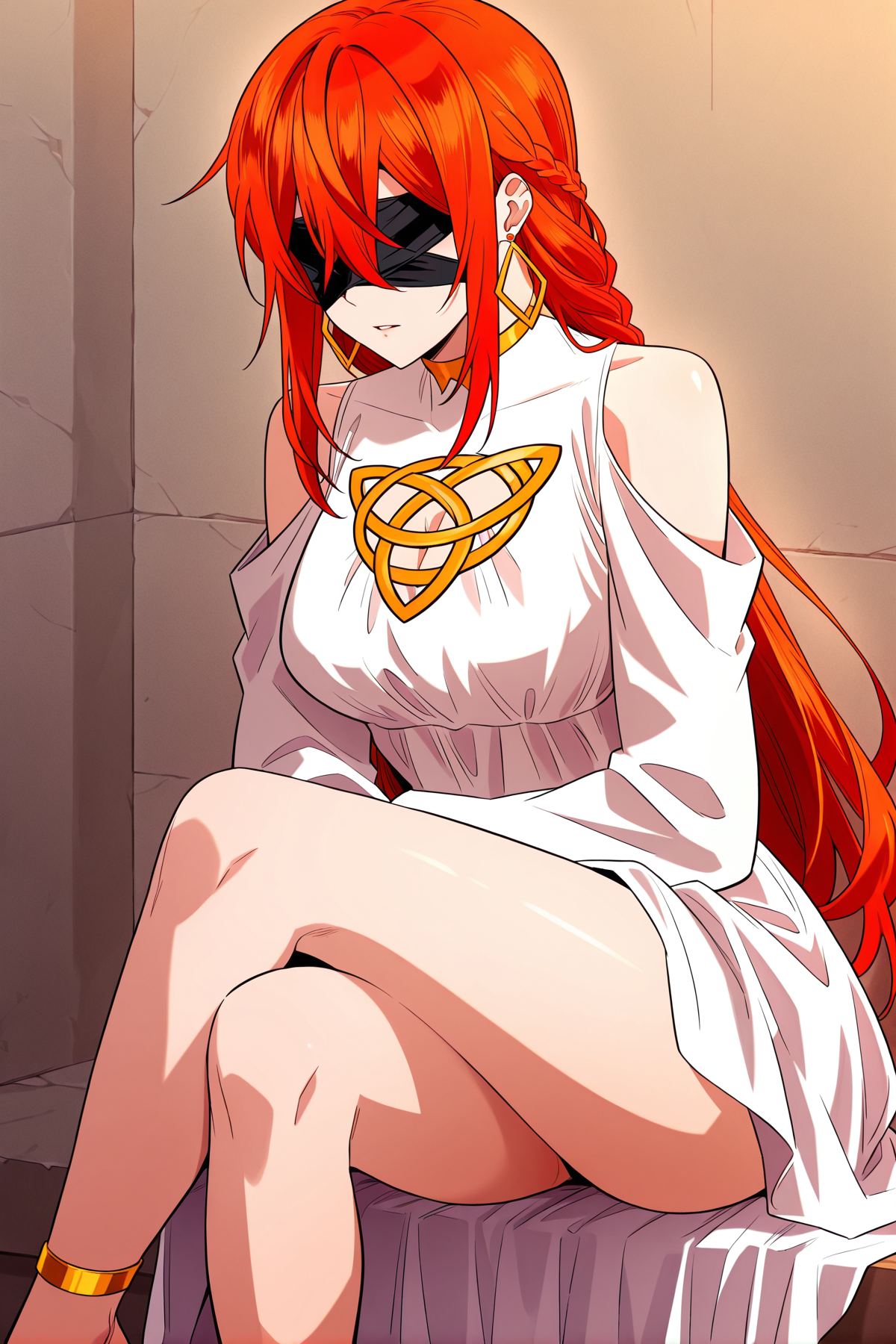 Urd, 1girl, solo, blindfolded eyes, long hair, orange hair, uneven bangs, hair between eyes, half up braids, loose hair ends, long sidelocks, earrings, geometric earrings, blindfold,