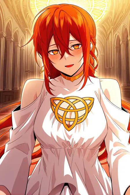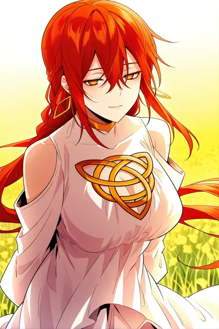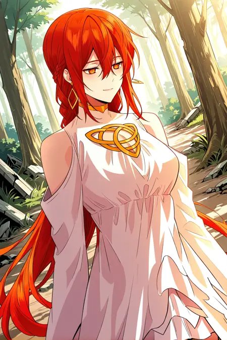 Urd, 1girl, solo, amber orange eyes, long hair, orange hair, uneven bangs, hair between eyes, half up braids, loose hair ends, long sidelocks, earrings, geometric earrings,