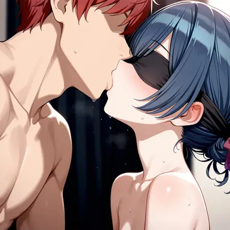 red eyes,blue hair,single hair bun,red hair ribbon,small breasts,
